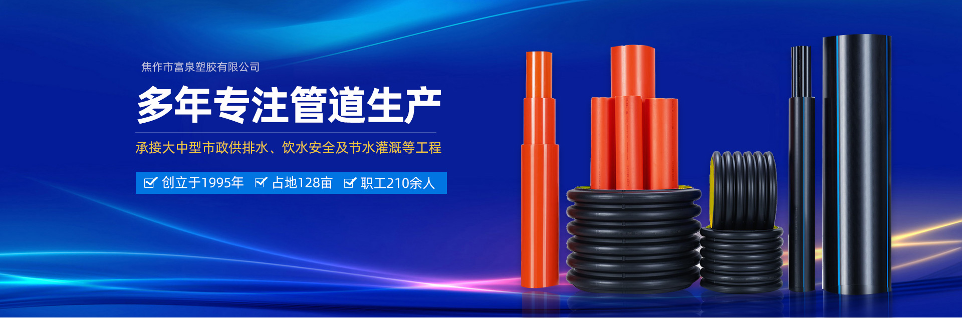 - 焦作市富泉塑胶有限公司,创立于1995年,是一家集研发、设计、生产、销售为一体的大型管材企业。公司位于太极故里、黄河之滨一一河南焦作温县。公司占地128亩,现有职工210余人,其中具有中技术职称的19人。生产、检验设备58台(套),包括PVC实壁管生产线11套、PE实壁管生产线12套、HDPE双壁波纹管生产线6套、PVC双壁波纹管生产线5套,检验设备14台(套)。主要产品有:Φ20mm-630mm、各种压力规格的PVCU、PVC-M、PE给水管材,PVC-U节水灌溉管材,HDPE燃气和矿用管材,DN200-800mm的HDPE、PVC双壁波纹管及各种喷灌、滴灌工程材料。承接大中型市政供排水、饮水安全及节水灌溉等工程?! 「蝗芙汗局厥硬返闹柿俊踩?、环保和节能,在同行业中率先完成了“新华节水产品认证”,全方面通过ISO9001:2008国际质量管理体系、IS014001:2004环境管理体系和OHSAS18001职业健康安全管理体系的一体化导入,并建立起规范的现代企业管理体系。公司以“质量”为先导,采用质量跟踪、多环节把关的方法,组建具有行业水准的企业技术检测中心,常年委托水利部节水灌溉设备检测中心、河南省产品质量监督检验院对产品跟踪检测,并由中国人民保险公司承保产品质量。公司连续多年被河南省水利厅确定为“安全饮水设备、节水灌溉设备”定点生产企业,并获得“中国名优产品”“质量、服务、信誉AAA企业”“河南省**产品”“河南省水利企业”“河南省守合同、重信用企业”等荣誉称号。 富泉塑胶公司坚持“用户为上”的服务理念,长期以来,全方面关注客户价值,不断提升服务水平。服务队伍常年为客户的产品设计、施工、安装提供合理的方案和全程细致、周到、**、快捷的技术服务。公司自成立以来,一直坚持以人为本的宗旨,塑造企业形象,并致力于新产品的开发,凭借雄厚的技术开发能力,先进的工艺制造流程,严格的质量管理保证体系,优良的售后服务网络,已成为河南省大的饮水、灌溉及排水管材设备制造商。产品畅销全国,而且还以公司雄厚的综合实力在业界中占据着重要的地位。